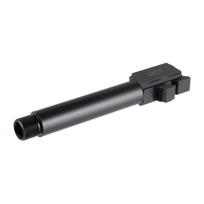 The Brownells Match-Grade Conversion Barrel enables you to switch your .40 S&W chambered Glock® 23 to shoot 9mm Luger (9x19mm) ammo AND also improve its accuracy potential at the same time. It fits Gen1 through Gen4 variants of the Glock® 23, and will be a drop-in install on most guns. Each conversion barrel is machined from 416R stainless steel alloy to precise dimensions to ensure a tight lockup and long service life. Button-rifled with 1-10" right-hand, 6-groove rifling that is compatible with inexpensive "practice" ammo that has non-jacketed bullets. The hard Black Nitride finish resists surface wear and stops in its tracks whatever corrosion might try to challenge the stainless steel. Available with either a Plain muzzle or Threaded (1/2"-28 tpi) to enable installation of a compensator or sound suppressor. Both have an 11-degree target crown, and each is laser engraved with the chambering and the Glock model it fits. Fits Glock® 23 Gen1 thru Gen4 G19-compatible 9mm magazine required to complete the conversion (not included) Extra-strong 416R stainless steel alloy Matte black Nitride anti-corrosion finish Button-rifled 1-10" twist Threaded model has 1/2"-28 tpi threads If you have an old Glock® 23 with a shot-out factory barrel, give it a new lease on life. Swap in a Brownells match-grade conversion barrel and enjoy the gentler recoil AND lower cost of 9mm ammo. Remember: to complete the conversion, you will need to add a Glock 19 compatible 9mm magazine.
