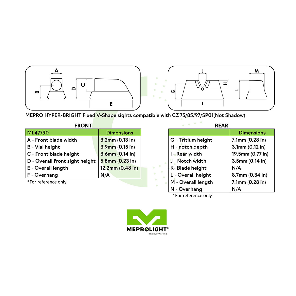 Die MEPRO HYPER-BRIGHT V-SIGHT FIXED SETS sind die hellsten Handgun-Sights der Welt, egal bei welchem Licht. Mit speziell formuliertem Tritium bieten sie eine branchenführende Brillanz von hellem Tageslicht bis Mitternacht.
