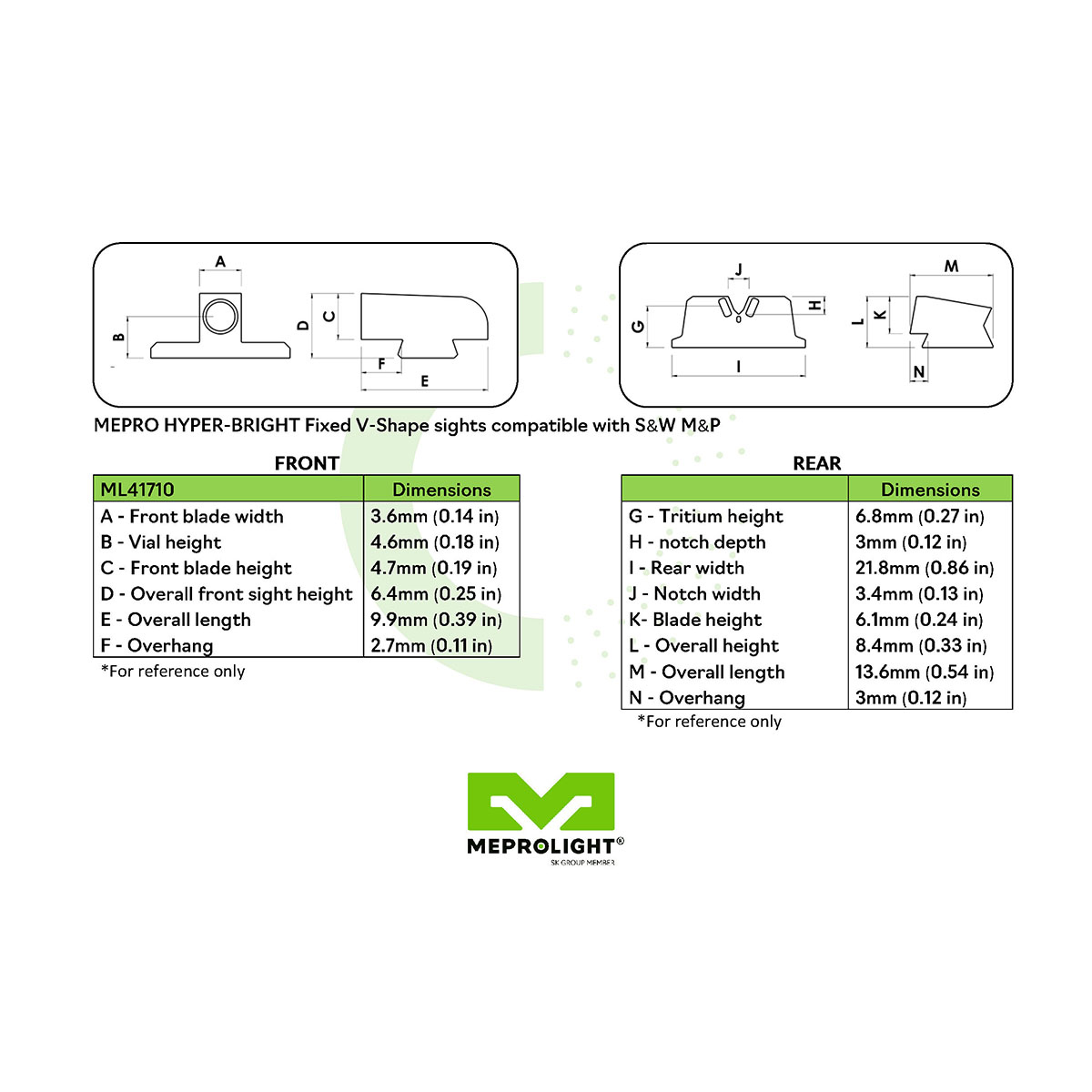 HYPER-BRIGHT CONCEPT: Mepro Hyper-Bright V-sights offer the most reliable illumination for day or night shooting. Mepro Hyper-Bright V sights feature an extremely bright contrasting colored ring on the front sight and V-shaped rear sight with two tritium vials and Yellow colored dot with radiant color that is charged by light and keeps glowing in lowlight conditions for a short time in conjunction with the tritium for fast and intuitive target acquisition.
