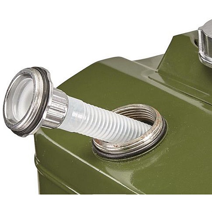 Der NATO Typ 5-Gallonen Jerry Can Kraftstoffflexauslauf ist im Lieferumfang enthalten und ermöglicht ein einfaches Ausgießen.