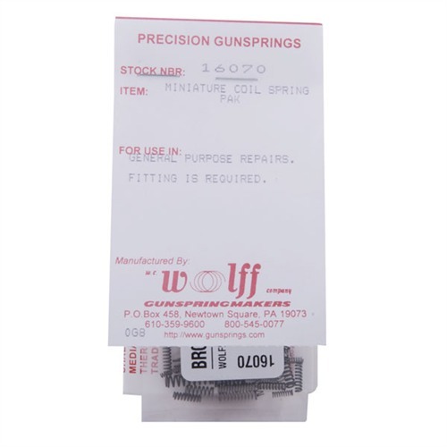 Mit dem MINIATURE COIL SPRING PAK - KIT #1607 von WOLFF erhältst du 50 Miniaturspiralfedern für Feuerwaffen. Diese Federn sind in verschiedenen Außendurchmessern erhältlich, von 1⁄16\" (1,7mm) bis 5⁄32\" (4mm), und bieten sowohl englische als auch metrische Varianten.