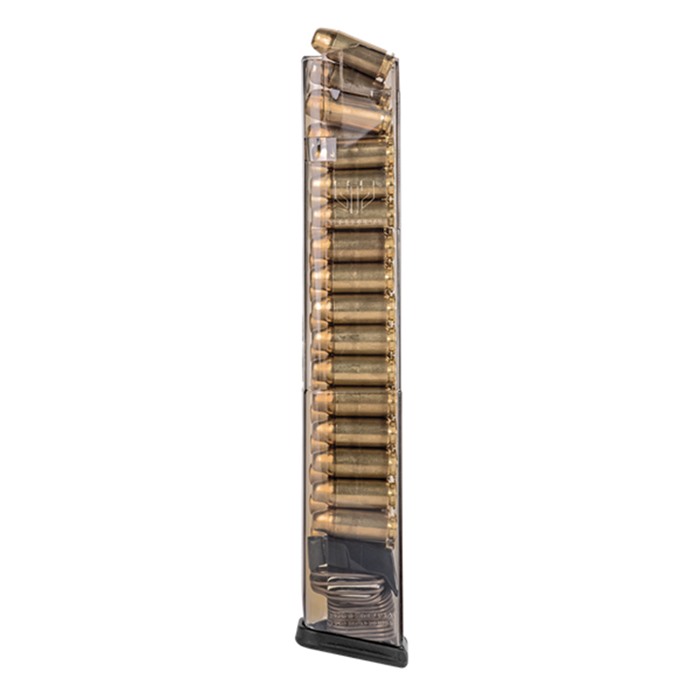 ETS translucent polymer magazines feature the reliability of OE mags with lightweight performance polymer construction and are competition legal. The translucent magazine bodies allow you to know immediately whether a magazine is loaded or not. The ETS competition legal translucent polymer magazines fit .40 S&W Glock models 22, 23, 24, 27, and 35. They are available in 19 (140mm), 24 (170mm), and 30 (210mm) round configurations, and are compatible with Gen 1 - Gen 4 Glocks. Easy disassembly with specially designed base plate Compatible with Glock, as well as aftermarket floorplates Creep resistant - feed lips and body won't spread when stored long term, even when loaded Let ETS competition legal translucent polymer magazines carry you to victory.