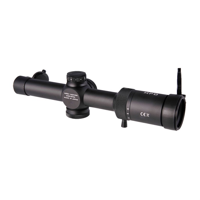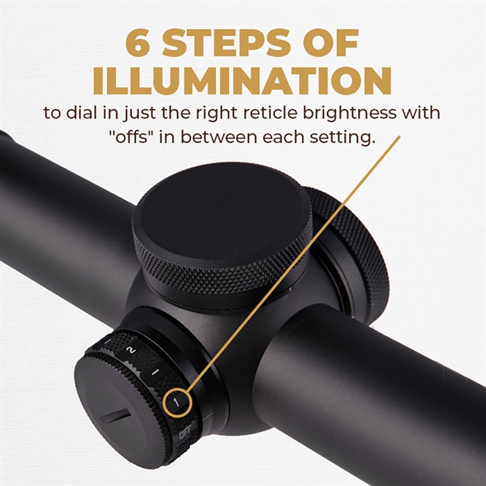 Das Absehen wird durch eine einzelne CR2032-Batterie rot beleuchtet und verfügt über 6 Helligkeitsstufen, einschließlich einer Aus-Position zwischen jeder Einstellung. Dieses 1-6x24 Zielfernrohr wird für Brownells in Japan montiert und verwendet Glas mit mehrschichtvergüteten Linsen und einem glaskeramischen Absehen.