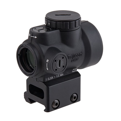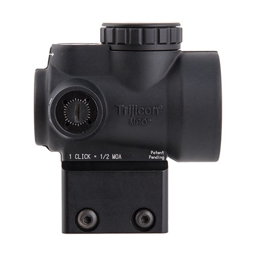 The Trijicon MRO™ (Miniature Rifle Optic) is a sealed miniature reflex sight intended for use on rifles, carbines and shotguns to provide fast target acquisition. The large aperture and tapered light path maximizes the viewing area and allows for better situational awareness and fast target engagement – especially from non-standard shooting positions. Combine all this with the ambidextrous brightness controls, sub-flush adjusters, advanced lens coatings and the fully sealed, waterproof, hard anodized forged 7075-T6 housing and you have the ultimate mini reflex sight on the market. The front, or objective lens is installed at a precise angle in order to reflect the red dot back to the user's eye.