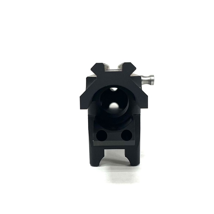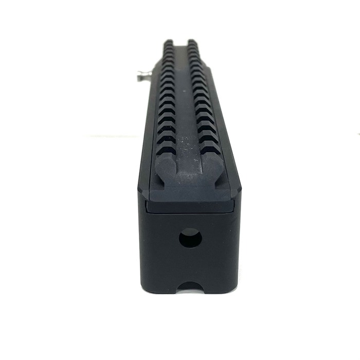 - Kürzere Front-Picatinny-Schiene und Mittelausschnitt für die Verwendung von standardmäßigen 10/22-Laufmontierten Kimme und Korn