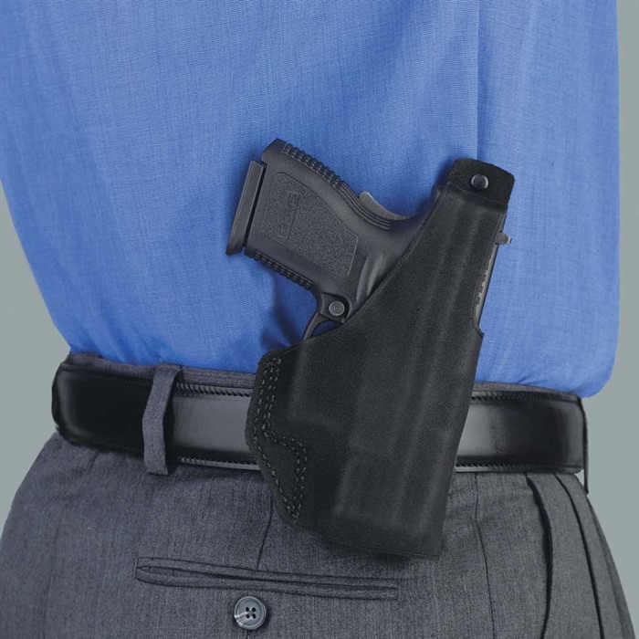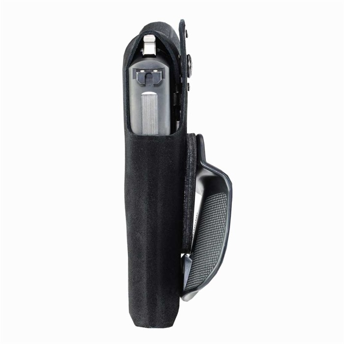 - Schiebe die Waffe vorsichtig in das Holster, bis sie vollständig sitzt.