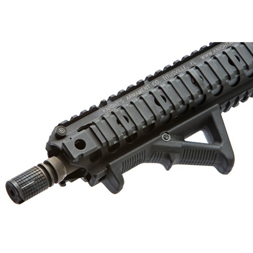 Low-profile forward grip/hand stop takes advantage of natural body mechanics to give the shooter more precise control, faster pointing, and less operator fatigue. The Magpul AFG™ (Angled Fore Grip) positions the support hand close to the centerline of the bore for maximum recoil control to aid in fast, accurate follow-up shots. Provides a consistent reference point for finding the correct hand position quickly when mounting the weapon under stress. The natural, ergonomic hand position with the palm facing up results in better blood flow than the “clenched fist” stance often used with vertical grips that leads to fatigue and loss of sensation during long periods in the ready position. Improves on the “thumb break” hold often used with standard vertical grips by allowing the thumb to rest comfortably alongside the top rail, pointing forward, with the rest of the hand in full contact with the forend. Heavy-duty reinforced molded polymer construction stands up to the hard knocks of tactical operations, and deep, molded-in grooves help you maintain a firm grip even with wet hands. Interchangeable inserts give the choice of a straight, uninterrupted gripping surface or one with a convenient ledge to support the index finger. Slides over any Picatinny-style rail and locks securely in place with a hardened steel crossbolt. The more compact AFG2™ is shorter and narrower to take up even less rail space, with enough clearance to fit a larger variety of weapons. Both models may be installed on tactical shotguns and other rifles with railed forends; won’t interfere with insertion and removal of magazines on AK-47s.