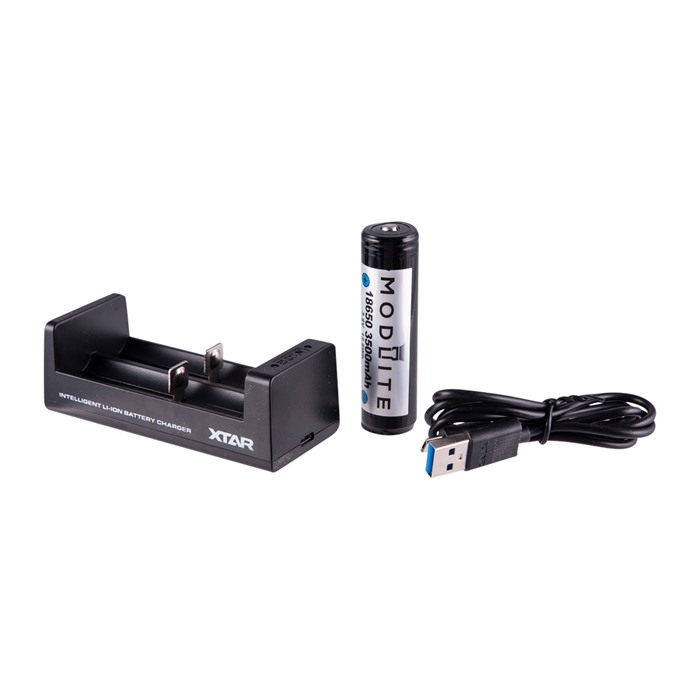 Das Modlite PLHv2 18650 Waffe Lichtpaket enthält einen PLHv2-Lampenkopf, einen 18650-Körper und die Option eines Tail Caps oder ohne Tail Cap. Es beinhaltet außerdem eine KeepPower 3500mAh 18650 Batterie und ein XTAR MC2 Ladegerät. (Artikel 100-042-503 enthält keinen Tail Cap oder Ladegerät).