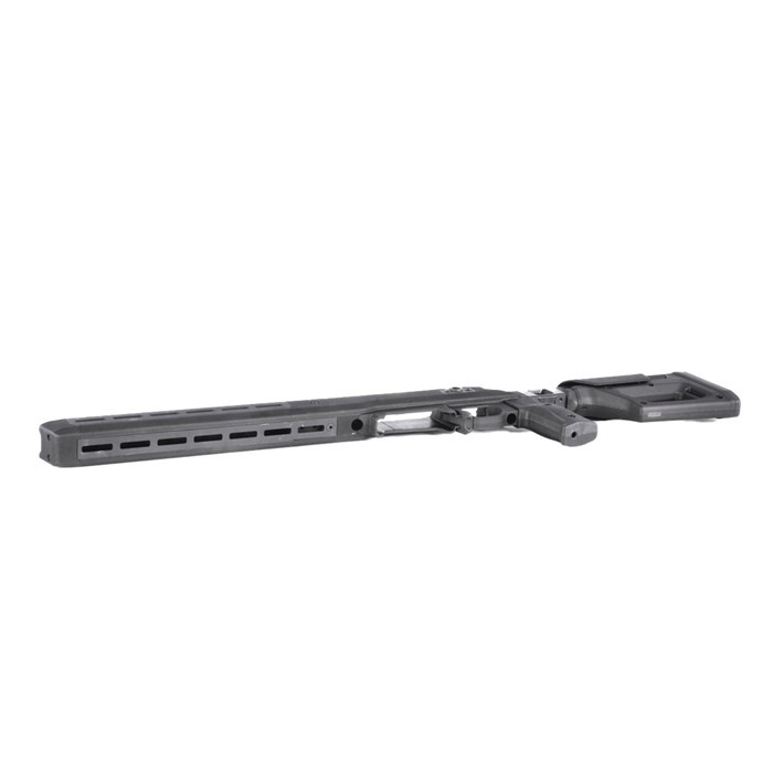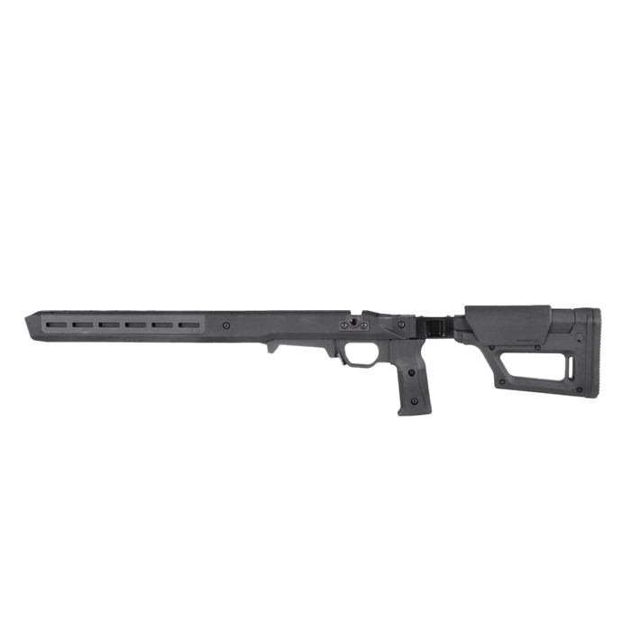 Maintaining the most important features of Magpul’s original Pro 700L, the Pro 700L Lite strikes a balance between features and cost without sacrificing performance. As the name suggests, the Pro 700L Lite blends the original Pro 700L Chassis and the PRS Lite stock to create a simplified rear end with a strong foundation – passing on the value and weight savings to you. The streamlined design weighs in at 4.5 pounds, a full pound less than its predecessor, but still packs a complete set of features that elevate your rifle’s performance. The Pro 700L Lite provides an optimized shooter interface with 0.8” of comb height and 1.4” of LOP adjustments (LOP measures 13.0” -14.4”). The low-profile rubber butt-pad is adjustable for height and cant, providing an extremely stable interface with the shooter’s shoulder. Sling attachment options include an ambidextrous 1.25” footman’s loop, a reversible QD sling swivel cup, and space for another optional QD sling swivel cup. The injection-molded polymer grip has a 5-degree forward edge sweep and enlarged palm swell with a 7-degree aft edge sweep for enhanced user comfort, and it includes a .75” fore/ aft adjustment range using a common hex wrench. An additional grip is included, offering a more aggressive sweep and enlarged palm swell for the shooter who is more inclined to a less vertical grip interface (8-degree forward / 20-degree aft edge sweep). The Pro 700L Lite surrounds its billet-aluminum chassis with Magpul polymer for enhanced ergonomics, strength, and sound mitigation. Built around the user, it is fully ambidextrous at the swap of a bolt retainer plate, and the vertical grip can be adjusted for various trigger reaches. The included large trigger guard can accommodate usage with gloves and aftermarket triggers. The AICS-pattern magazine well features an ambidextrous mag release and has a front barricade stop to prevent the rifle from resting on the magazine when using barricade support. Up front, there are numerous M-LOK slots (left-6 / right-6 / bottom-7) allowing you to mount whatever accessories your loadout calls for. Extremely versatile and adaptable, the Pro 700L Lite turns your long action, 700-pattern rifle into the perfect bolt action precision machine. FEATURES Fully machined aluminum fore end and bedding block AICS compatible bottom metal Vertical grip with adjustment for trigger reach Large trigger guard accommodates gloves and aftermarket triggers Compatible with left and right-handed actions Comb height, LOP, and butt pad adjustment from PRS Lite Injection-molded polymer grip with 5-degree forward edge sweep and enlarged palm swell with 7-degree aft edge sweep for enhanced user comfort combined with a .75” fore/aft adjustment range using a common hex wrench Additional grip option included with a more aggressive sweep and enlarged palm swell for the shooter that is more inclined to a less vertical grip interface (8 degree forward / 20-degree aft edge sweep) Multiple sling attachment points (an ambidextrous 1.25” footman’s loop, a reversible QD sling swivel cup, and a space for another optional QD sling swivel cup Made in the USA COMPATIBILITY Compatible with Remington® 700 Long Action and other Remington 700 Long Action footprints. Buttstock/cheek riser must be removed on the Pro 700L Lite before the user can remove the bolt from the action. Ships with MAG698 (Magnum Long Action AICS 5-round PMAG)