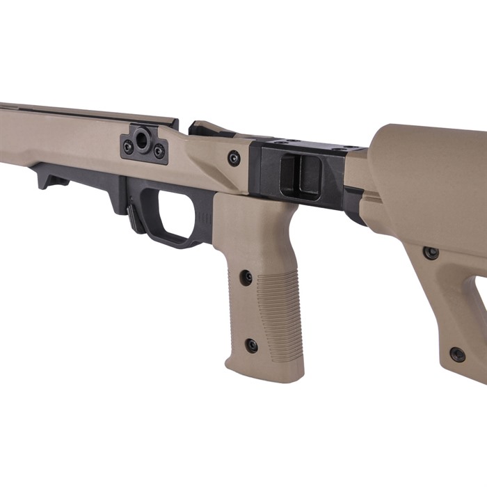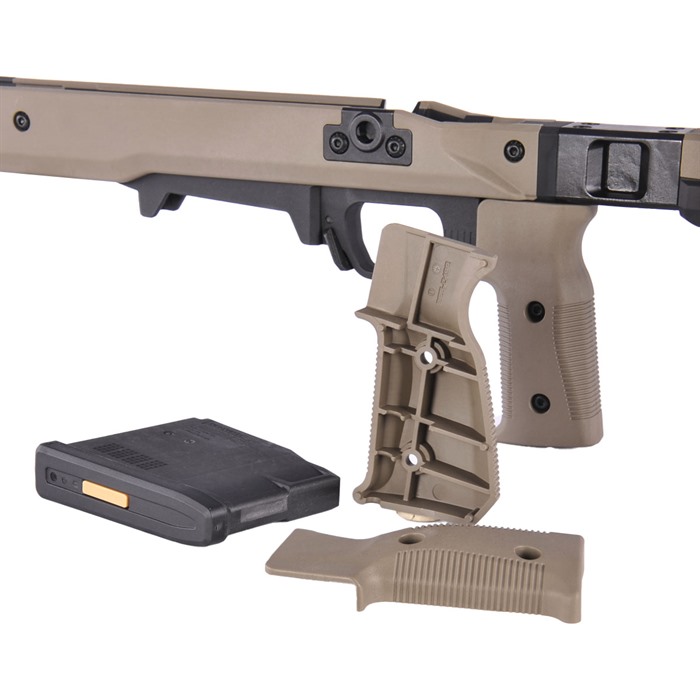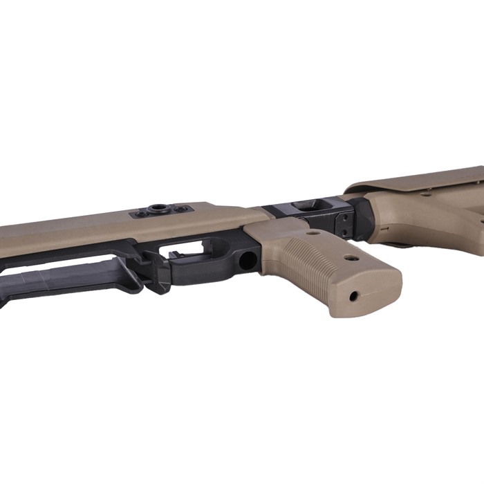 Kompatibel mit Remington® 700 Long Action und anderen Remington 700 Long Action Fußabdrücken. Der Schaft-/Wangenauflage muss bei der Pro 700L Lite entfernt werden, bevor der Benutzer den Bolzen aus der Aktion entfernen kann. Wird mit MAG698 (Magnum Long Action AICS 5-Runden PMAG) geliefert.