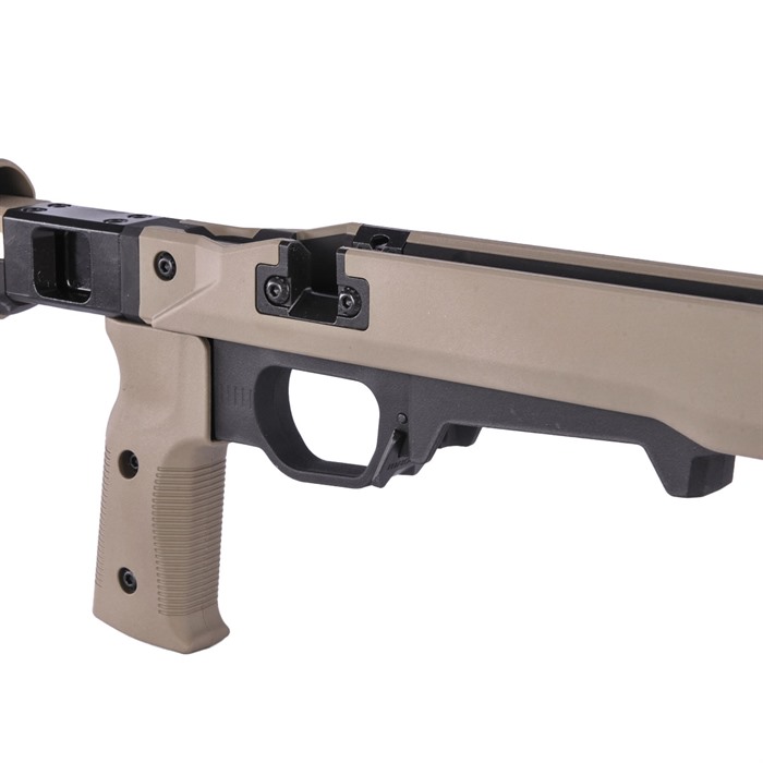 Maintaining the most important features of Magpul’s original Pro 700L, the Pro 700L Lite strikes a balance between features and cost without sacrificing performance. As the name suggests, the Pro 700L Lite blends the original Pro 700L Chassis and the PRS Lite stock to create a simplified rear end with a strong foundation – passing on the value and weight savings to you. The streamlined design weighs in at 4.5 pounds, a full pound less than its predecessor, but still packs a complete set of features that elevate your rifle’s performance. The Pro 700L Lite provides an optimized shooter interface with 0.8” of comb height and 1.4” of LOP adjustments (LOP measures 13.0” -14.4”). The low-profile rubber butt-pad is adjustable for height and cant, providing an extremely stable interface with the shooter’s shoulder. Sling attachment options include an ambidextrous 1.25” footman’s loop, a reversible QD sling swivel cup, and space for another optional QD sling swivel cup. The injection-molded polymer grip has a 5-degree forward edge sweep and enlarged palm swell with a 7-degree aft edge sweep for enhanced user comfort, and it includes a .75” fore/ aft adjustment range using a common hex wrench. An additional grip is included, offering a more aggressive sweep and enlarged palm swell for the shooter who is more inclined to a less vertical grip interface (8-degree forward / 20-degree aft edge sweep). The Pro 700L Lite surrounds its billet-aluminum chassis with Magpul polymer for enhanced ergonomics, strength, and sound mitigation. Built around the user, it is fully ambidextrous at the swap of a bolt retainer plate, and the vertical grip can be adjusted for various trigger reaches. The included large trigger guard can accommodate usage with gloves and aftermarket triggers. The AICS-pattern magazine well features an ambidextrous mag release and has a front barricade stop to prevent the rifle from resting on the magazine when using barricade support. Up front, there are numerous M-LOK slots (left-6 / right-6 / bottom-7) allowing you to mount whatever accessories your loadout calls for. Extremely versatile and adaptable, the Pro 700L Lite turns your long action, 700-pattern rifle into the perfect bolt action precision machine. FEATURES Fully machined aluminum fore end and bedding block AICS compatible bottom metal Vertical grip with adjustment for trigger reach Large trigger guard accommodates gloves and aftermarket triggers Compatible with left and right-handed actions Comb height, LOP, and butt pad adjustment from PRS Lite Injection-molded polymer grip with 5-degree forward edge sweep and enlarged palm swell with 7-degree aft edge sweep for enhanced user comfort combined with a .75” fore/aft adjustment range using a common hex wrench Additional grip option included with a more aggressive sweep and enlarged palm swell for the shooter that is more inclined to a less vertical grip interface (8 degree forward / 20-degree aft edge sweep) Multiple sling attachment points (an ambidextrous 1.25” footman’s loop, a reversible QD sling swivel cup, and a space for another optional QD sling swivel cup Made in the USA COMPATIBILITY Compatible with Remington® 700 Long Action and other Remington 700 Long Action footprints. Buttstock/cheek riser must be removed on the Pro 700L Lite before the user can remove the bolt from the action. Ships with MAG698 (Magnum Long Action AICS 5-round PMAG)