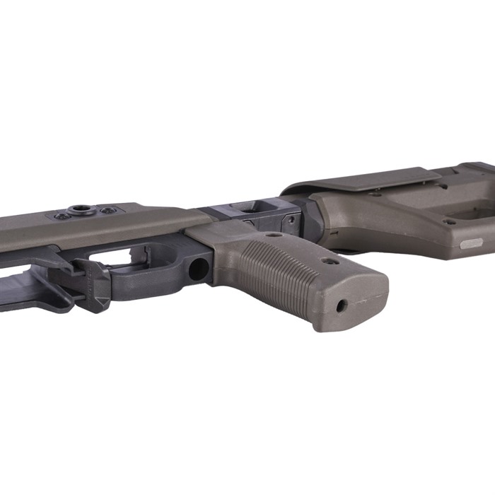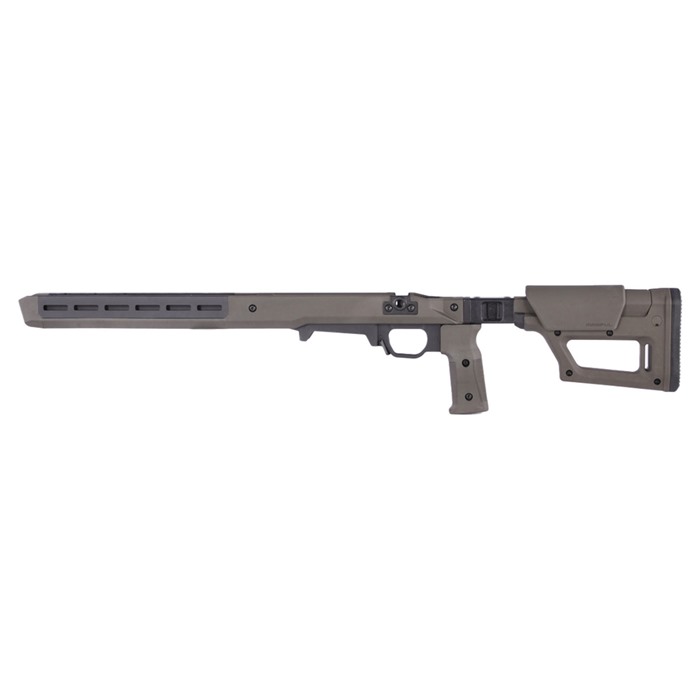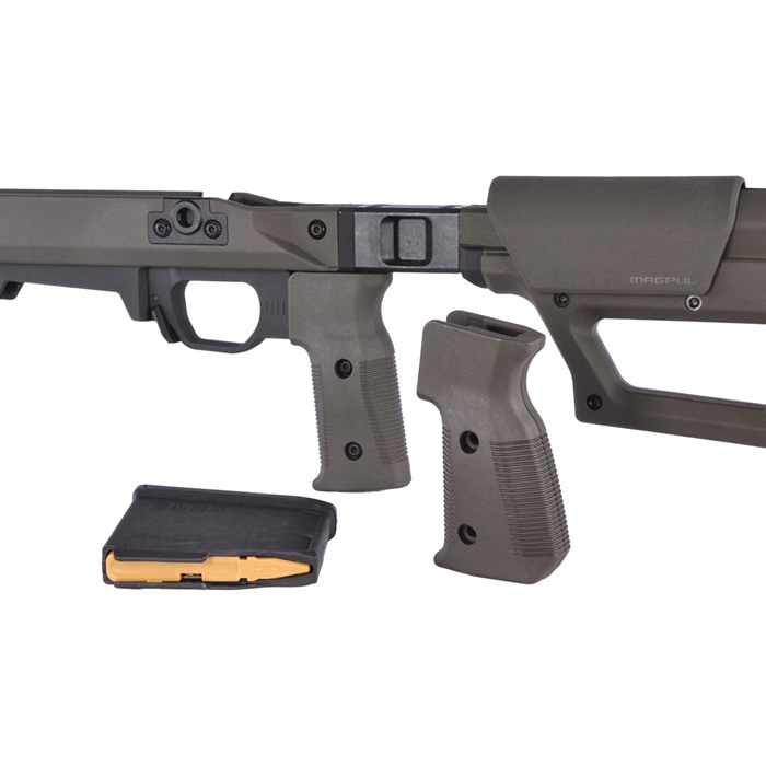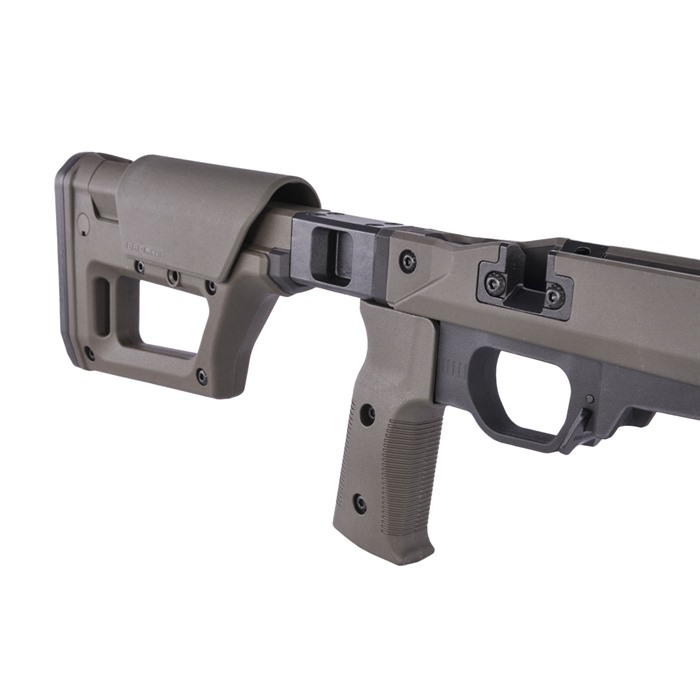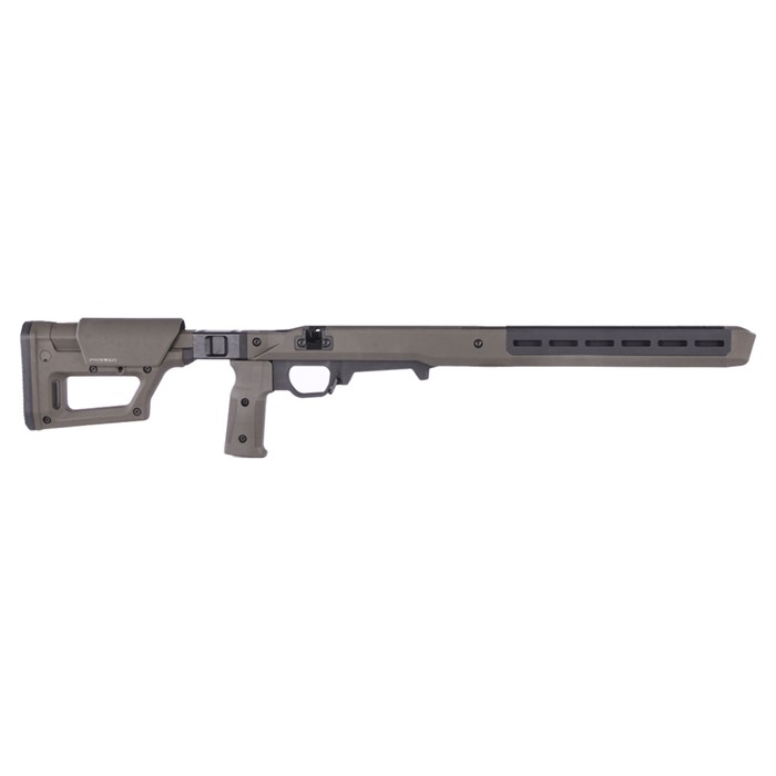 Maintaining the most important features of Magpul’s original Pro 700L, the Pro 700L Lite strikes a balance between features and cost without sacrificing performance. As the name suggests, the Pro 700L Lite blends the original Pro 700L Chassis and the PRS Lite stock to create a simplified rear end with a strong foundation – passing on the value and weight savings to you. The streamlined design weighs in at 4.5 pounds, a full pound less than its predecessor, but still packs a complete set of features that elevate your rifle’s performance. The Pro 700L Lite provides an optimized shooter interface with 0.8” of comb height and 1.4” of LOP adjustments (LOP measures 13.0” -14.4”). The low-profile rubber butt-pad is adjustable for height and cant, providing an extremely stable interface with the shooter’s shoulder. Sling attachment options include an ambidextrous 1.25” footman’s loop, a reversible QD sling swivel cup, and space for another optional QD sling swivel cup. The injection-molded polymer grip has a 5-degree forward edge sweep and enlarged palm swell with a 7-degree aft edge sweep for enhanced user comfort, and it includes a .75” fore/ aft adjustment range using a common hex wrench. An additional grip is included, offering a more aggressive sweep and enlarged palm swell for the shooter who is more inclined to a less vertical grip interface (8-degree forward / 20-degree aft edge sweep). The Pro 700L Lite surrounds its billet-aluminum chassis with Magpul polymer for enhanced ergonomics, strength, and sound mitigation. Built around the user, it is fully ambidextrous at the swap of a bolt retainer plate, and the vertical grip can be adjusted for various trigger reaches. The included large trigger guard can accommodate usage with gloves and aftermarket triggers. The AICS-pattern magazine well features an ambidextrous mag release and has a front barricade stop to prevent the rifle from resting on the magazine when using barricade support. Up front, there are numerous M-LOK slots (left-6 / right-6 / bottom-7) allowing you to mount whatever accessories your loadout calls for. Extremely versatile and adaptable, the Pro 700L Lite turns your long action, 700-pattern rifle into the perfect bolt action precision machine. FEATURES Fully machined aluminum fore end and bedding block AICS compatible bottom metal Vertical grip with adjustment for trigger reach Large trigger guard accommodates gloves and aftermarket triggers Compatible with left and right-handed actions Comb height, LOP, and butt pad adjustment from PRS Lite Injection-molded polymer grip with 5-degree forward edge sweep and enlarged palm swell with 7-degree aft edge sweep for enhanced user comfort combined with a .75” fore/aft adjustment range using a common hex wrench Additional grip option included with a more aggressive sweep and enlarged palm swell for the shooter that is more inclined to a less vertical grip interface (8 degree forward / 20-degree aft edge sweep) Multiple sling attachment points (an ambidextrous 1.25” footman’s loop, a reversible QD sling swivel cup, and a space for another optional QD sling swivel cup Made in the USA COMPATIBILITY Compatible with Remington® 700 Long Action and other Remington 700 Long Action footprints. Buttstock/cheek riser must be removed on the Pro 700L Lite before the user can remove the bolt from the action. Ships with MAG698 (Magnum Long Action AICS 5-round PMAG)