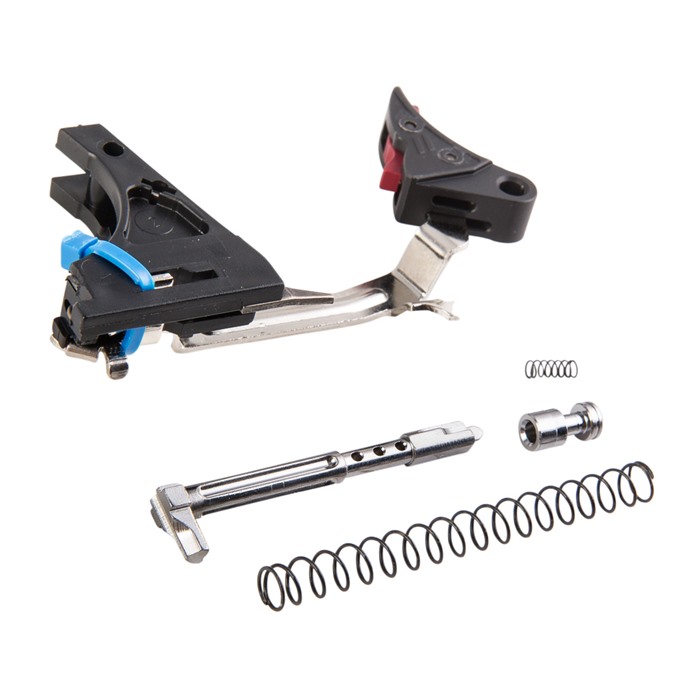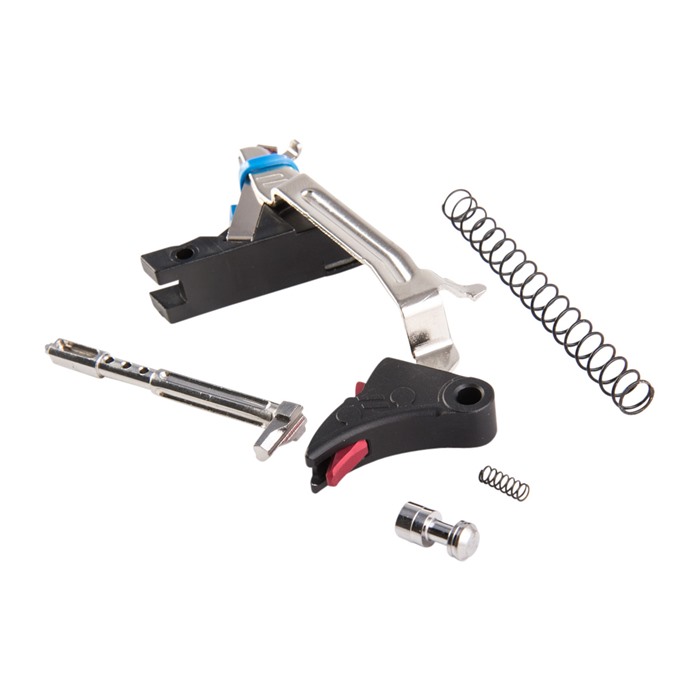 Zev beginnt mit ihrem eigenen Abzug, Abzugsstange, Abzugsblock, Auswerfer, Verbindungselement, Abzugfeder, einem leichten Edelstahl-Zündstift sowie einem Sicherheitsplunger und einer Feder, um den Abzugsweg zu verfeinern. Sie fügen auch eine reduzierte Schlagfeder hinzu, um ein leichteres Abzugsgefühl für Wettkämpfe zu erzeugen, sowie die werkseitige Schlagfeder für den täglichen Einsatz und den Dienstgebrauch.