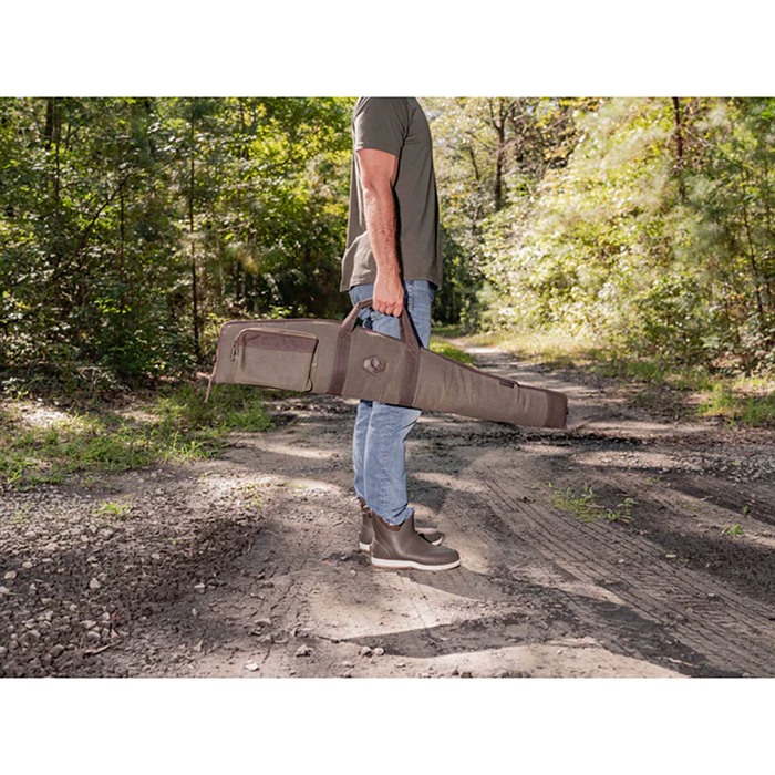 RAWHIDE WAXED RIFLE CASE Make your hunting season your best yet. Gear up with Evolution Outdoor! Experience the Evolution Outdoor Rawhide Series Rifle Case. The Rawhide Series WAXED CANVAS RIFLE CASE is heralded as one of the BEST GUN CASES on the market. With its antique brass features & heavy gauge foam padding, not only does this case look good but will keep your firearm fully protected. FEATURES: Quality Firearm Protection Durable 24 oz. cotton duck canvas Full length zippers Antique brass zippers Leatherette logo patch Plaid flannel lining to protect your firearm’s finish Front zippered storage pocket Heavy gauge interior foam padding for maximum impact resistance Tall Profile Fits Scoped Rifles SPECIFICATIONS: 1.5” inch webbing straps Size: 48” Length (Inner Dimensions: 46" Length)