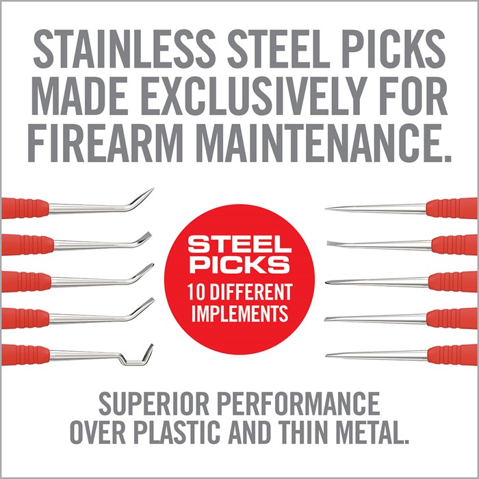 Das ergonomische Design und die aus rostfreiem Stahl gefertigten Picks liegen bequem in deiner Hand und bieten eine überlegene Kontrolle beim Reinigen von schwer zugänglichen Bereichen. Ideal für die allgemeine Waffenwartung, wo Plastikpickel und Reinigungsmittel nicht ausreichen.