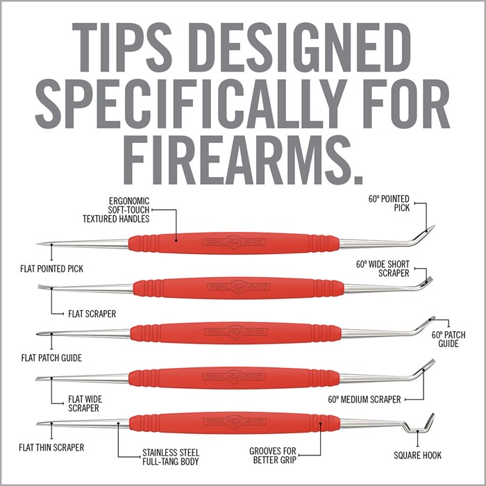 Waffenbesitzer mussten jahrelang mit minderwertigen Reinigungswerkzeugen auskommen. Die ACCU-GRIP STEEL PICKS bieten speziell gestaltete Spitzen, die die Arbeit an Kohlenstoffablagerungen erleichtern.