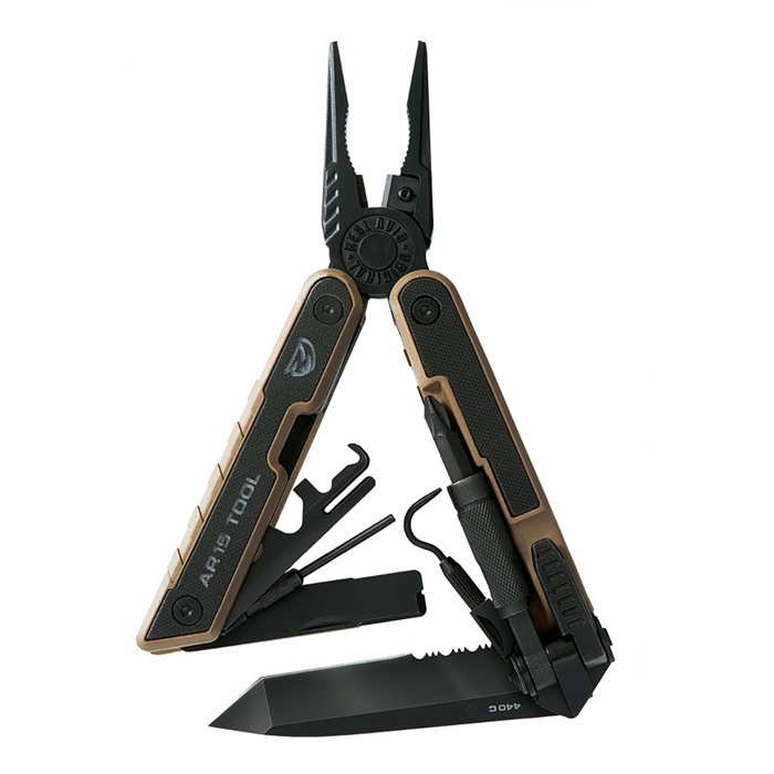 Das AR15 Tool verfügt außerdem über einen Carbide-Glasbrecher, eine 3,25 Zoll lange 440C Edelstahl-Serrated Tanto-Klinge, ein Bolt Override Tool, eine Spitzzange, einen Carbide-Cutter und einen Schlaghammer. Dieses Tool hat auch einen abnehmbaren Stift und einen Pick, die austauschbar sind, um 8-32 männliche und weibliche Adapter für Reinigungsbürsten und -stäbe zu passen.