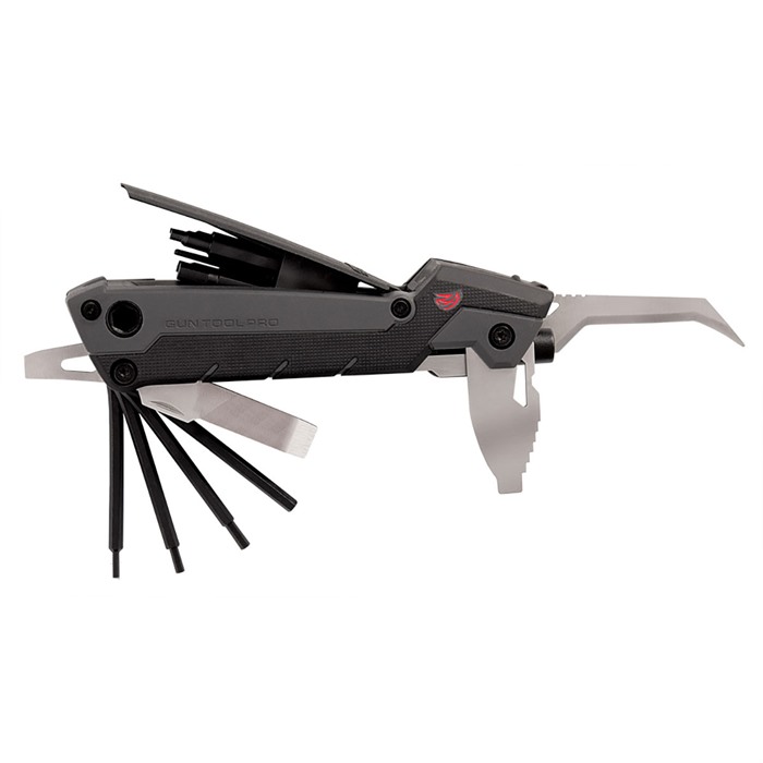 813119011498 Für Gewehre und Schrotflinten entwickelt, bietet der Gun Tool Pro einen stabilen Rahmen mit 30 vielseitigen Werkzeugen. Die zwei Zoll langen Bits passen in den magnetischen 1/4"-Treiber und den 1/4"-Schlüssel für zusätzliches Drehmoment. Er verfügt über zwei Feilen, ein verriegelbares Klingenmesser und einen abnehmbaren magnetischen Aufbewahrungsbehälter für kleine Schrauben und Stifte. Außerdem beinhaltet er einen universellen Choke-Schlüssel und einen Schlaghammer, alles in einem eleganten Design. Der Gun Tool Pro setzt den Standard für kompakte Waffenwerkzeuge. Eigenschaften: - 30-in-1 Multitool für Feuerwaffen, speziell für Waffenbesitzer entwickelt - Alles, was du für die grundlegende Wartung von Feuerwaffen benötigst - Abnehmbarer magnetischer Aufbewahrungsbereich für kleine Stifte und Teile - Universeller Choke-Schlüssel für Schrotflinten und spezifische Bits für Feuerwaffen.Nicht verfügbar.