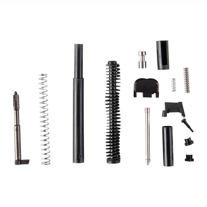 Contains all the parts you need to complete the innards of an aftermarket slide or refurbish a factory slide to like-new standards. All the parts in our Glock 17® Gen3 Slide Parts Kit are aftermarket parts made to the correct dimensions for proper fit, finish, and function in a factory spec slide. The extractor and firing pin are made from cast 17-4 SS. The extractor depressor plunger and firing pin safety are machined from bar stock. Includes channel liner tool to properly install the channel liner. Kit Includes: Extractor Extractor Depressor Plunger Extractor Depressor Plunger Spring Spring -Loaded Bearing Slide Cover Plate Firing Pin Spacer Sleeve Firing Pin Spring Spring Cups Firing Pin Safety Firing Pin Safety Spring Channel Liner Channel Liner Tool Guide Rod and Recoil Spring Assembly