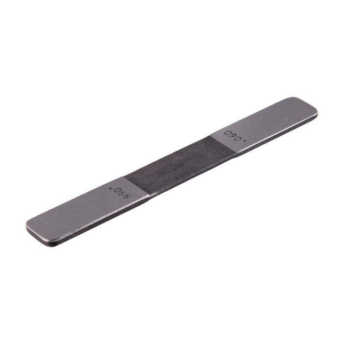 Dieses doppelseitige Messgerät überprüft das Kopfspiel bei jedem .38/.357 Revolver, dessen Zylinderkammern nicht für den Patronenrand versenkt sind. Es funktioniert mit Ruger S.A. und D.A. (60-66), S&W's (60-68) und anderen, die die gleichen GO- und NO GO-Spezifikationen haben.