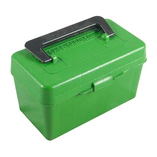 100 Round Box Specially designed for shooters who require a 100 round supply of very accurate ammunition (such as big bore, varmint hunters, etc.) The R-100 provides excellent protection for reloads and when the rounds are in the down position, they are protected by four special fingers which keep your bullets from hitting the bottom of the box and causing tip damage (which can change flight characteristics). It comes with adjustable inner trays which offer two height positions for different cartridge lengths. Features: Polypropylene construction with a scuff resistant, textured finished that will not crack, ship, contract, expand or warp An integral "living hinge" with a 10-year guarantee Snap-Lok latch to prevent spilling Folding handle for easy storing and stacking Pressure sensitive load label provided for recording load and sight data 50 Round Box These deluxe 50 round capacity boxes were designed for ultimate ammo protection and ease of transporting. Bullets are placed in the box in the down position and are protected by four special fingers. These fingers are designed to keep most bullet tips from hitting the bottom of the box, preventing tip damage that can change bullet flight characteristics. There is also extra space provided between rounds to facilitate easy removal. The convenient fold down carrying handle is specifically designed so that belted magnum rounds can be carried rim up or down. The H-50-XL is for the extra large hunting rounds. The calibers listed are for bullet up position; however, some of the rimmed cases will fit better bullet down. See bullet chart for your caliber. Features bullet tip protection, where most bullets will not touch the bottom of the box. As you can see the Max. OAL UP will be shorter than when the bullet is in the down position. Features: Full length mechanical hinge H-50 Series uses a tray which spaces the rounds out for easy removal. Convenient handle for carrying Bullet tip protection Stackable and lockable design Full length mechanical hinge