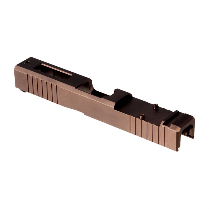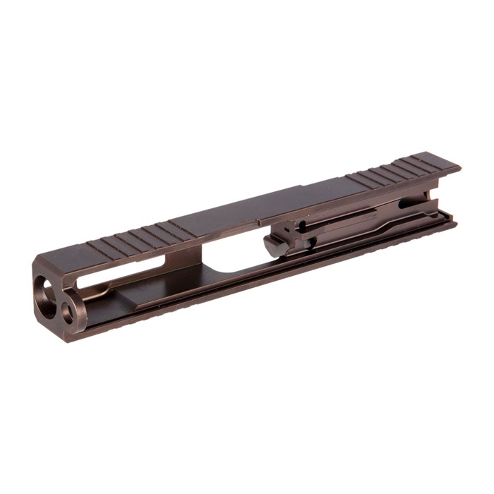 The limited production Brownells Brown RMR Slide for Glock® 19 Gen3 pistols features a pre-cut slot for easy, secure, low-profile mounting of a Trijicon RMR or Holosun red dot sight. Up front, there are distinctive, cocking serrations that aid in manipulating the slide to check the chamber or clear a jam. And we’ll admit it: the serrations just look cool, too. All RMR Slides also have standard Glock® factory front and rear sight dovetails for "iron" sights. To get proper co-witnessing with the RMR, you will need to also install suppressor-height iron sights. These limited production Brownells Brown slides for the Glock® 19 Gen3 come with a "window" cutout on top between the front serrations that enhances airflow to keep the barrel cooler - ideal for hard-working action competition pistols. Plus, if you have an upgraded barrel with a contrasting finish or a unique exterior pattern (fluting, spirals, "flames," etc.) the window lets you show it off a bit! A Brownells RMR Slide is the ideal upgrade for your factory Glock® 19 Gen3 OR the perfect "top half" for a brand-new custom gun built on a Polymer80 80% frame. Fits Gen3 Glock® 19 pistols & clones Built-in Trijicon RMR mounting slot Also accepts Holosun HE508T, HS507C & HS407C red dot sights Factory front/rear iron sight cuts, too Machined from corrosion-resistant 17-4 stainless steel billet Each RMR Slide for Glock® starts life as a billet of 17-4 stainless steel that is machined to Glock® factory specifications inside, so it’ll accept factory or aftermarket barrels and internal parts. Each slide is heat-treated to Rc 41-44 on the Rockwell C scale for added surface hardness and wear resistance. The Brownells Brown slide is a limited production and once they are gone, they’re gone. Brownells Gun Tech™ Note: Channel liner required for these slides. Channel liner is a press fit and requires a tool to install. We recommend #777-100-017. Includes patented optic cut technology pioneered by ZEV Technologies. Patent No. RE47335