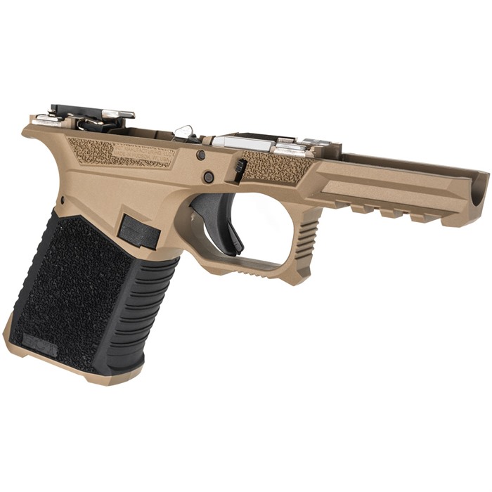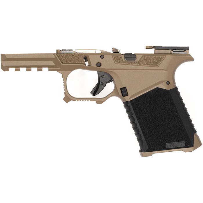 This SCT Manufacturing Glock® Compatible Full-Size assembled Frame is going to change the way you build pistols. It is the only frame at this price point packed with this level of features. This is a serialized frame with shooter-oriented ergonomics. Installed over-molded rails that are ready to build. They are made with an industry leading proprietary polymer blend and compatible with Glock® Gen 3 19, 23 and 32 parts. Each frame is assembled by a certified armorer utilizing SCT Manufacturing lower parts kits which have been tested and proven to meet or exceed OEM specifications. The last step of each frame assembly is function testing utilizing a GLOCK™ factory slide checking for safe operation, striker engagement, trigger pull, & trigger reset ensuring the end user is left with a frame that needs nothing but a slide assembly right out of the box! Frame assembly includes: SCT19polymer frame, electroless nickel locking block, polished trigger assembly with electroless nickel trigger bar and polymer trigger, standard polymer magazine catch, magazine catch spring, steel trigger pin, steel locking block pin, standard slide lock, slide lock coil spring, polymer trigger housing pin, trigger housing with GEN4 style ejector, standard slide stop assembly & polished 5.5 lb. electroless nickel trigger connector. FEATURES: Proprietary rubber over mold contour grip with aggressive texturing providing a non-slip grip, shock absorption, vibration dampening and enhanced durability Serrations and index point on trigger guard to help control recoil Serrations on top of beaver tail reduce glare Flared mag well Thumb Accelerator pad Picatinny rail (not a Glock® rail) “MIL-STD 1913 Picatinny” High beaver tail with low profile bore axis Grip angle is the same as Glock® Slide stop guard Larger trigger guard for better access with gloves Recessed contoured mag release area for faster mag changes Multi caliber- Compatible with compact 9mm, .40 cal, .357SIG Mag Well compatibility – SCT 19 Magwell