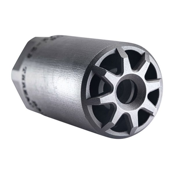 Badlands. The first integrated muzzle brake and blast deflector 3D printed as one cohesive part. Made from high strength 17-4 stainless, heat treated to H900 and then nitrided with a QPQ process for extremely high corrosion resistance. The combination of the material, the heat treat process and the hard coating enable Badlands to withstand full auto fire. The internal muzzle brake helps reduce recoil and muzzle rise by uniformly dissipating gasses through coned ports that counter recoil. Taming the dramatically expanding gasses associated with muzzle blast. The integrated blast deflector directs blast concussion where it belongs... down range. It also provides significant concussion reduction for those on either side of the shooter's firing position. With no external side vents or ports, Badlands also helps limit the dust & debris signature if you are firing from a prone position. The combined muzzle brake and blast deflector has a number of internal flash reduction features as well. Geometrically complex internal ribbing not possible through traditional machining methods go a long way toward disrupting unspent gunpowder and gasses expelled when the bullet leaves the barrel, thereby reducing the amount of combustion occurring outside the muzzle device. Badlands is offered in two models, differentiated only by the direct thread offering. Choose 1/2"-28 or 5/8"-24. Either is suitable for calibers ranging from .223 up through .354. So whether you are shooting .223/5.56, a PCC in 9mm, 300 Blackout, 6.5 Grendel, 6.5 Creedmoor, .308, or even 338 Federal, Badlands is going to work for your application. 1.5" Outside Diameter. 2.75" length. Weight ~7.1 ounces. Installation: We recommend 1-2 drops of Rocksett. Rocksett has a very high temperature resistance (up to ~2,000 degrees) but its breakaway torque is relatively low (which is nice if you ever decide you want to remove the device). It really only takes 1-2 drops so don't go heavy with it.