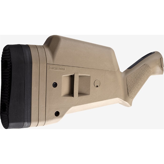 The SGA Stock is an ambidextrous, user-configurable buttstock designed to add much-needed adjustability to the tried-and-true Remington 870 12-gauge shotgun. Featuring a spacer system for length of pull adjustment, improved grip ergonomics, recoil-reducing butt-pad, optional cheek risers for use with optics / raised sights, and other accessories, The SGA 870 brings Magpul design and engineering to another classic American firearm. Available in Black, Flat Dark Earth, Stealth Gray and Orange to adapt to the mission at hand. Made in the USA. FEATURES Spacer-adjustable lop in 1/2" increments from 12.5" to 14.5" Recoil-reducing butt-pad Integral right & left 1.25" sling loops Enhanced grip angle ergonomics SPECS Platform: Shotgun Compatibility: Remington 870 12-gauge shotgun Butt-Pad Dimensions: 1.5 x 5.0 in. LOP Adjustment Range: ~12.3-14.3 in. Weight: 1.5 lbs. (with two Spacers installed) Width of Butt, max: 1.5 in.