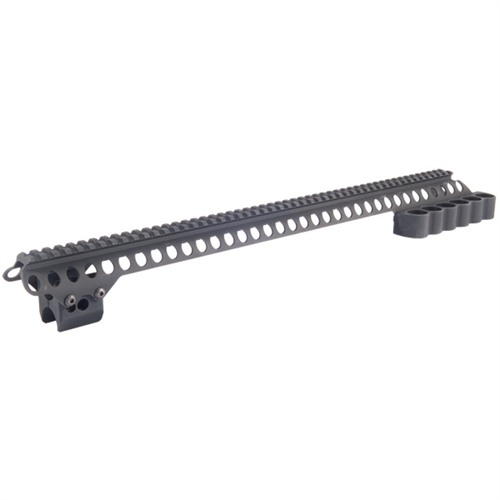 Mesa Tactical Sureshell Shell Carrier and 20” Rail for the Remington 870. These Shell Carriers & Rails hold 6 12 gauge shotgun shells and can accommodate a wide variety of optics. With the 20” rail length, iron sights traditionally used on an AR-15 can be used. The user can also mount optics with varying degrees of eye relief anywhere on the Picatinny rail. With such a generous amount of rail space, sling mounts and lights can be mounted as well. The Sureshell Carrier and Rails are constructed of aluminum with a matte black finish. The Remington 870 model is compatible with factory magazine extensions and is required on most models.