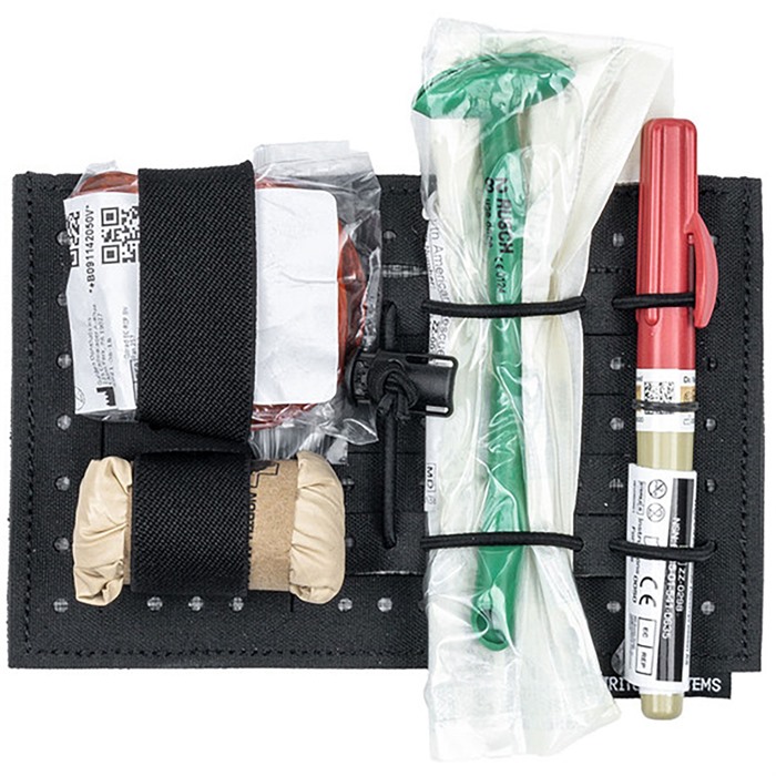 Der Configurable Med Tray Insert misst 7" breit x 4.5" hoch und wird mit 4 Schnappverschlüssen sowie 4 Fuß Shock Cord geliefert, das auf die gewünschte Länge zugeschnitten werden kann. Einige Bilder zeigen optionale Zubehörteile, die separat verkauft werden.