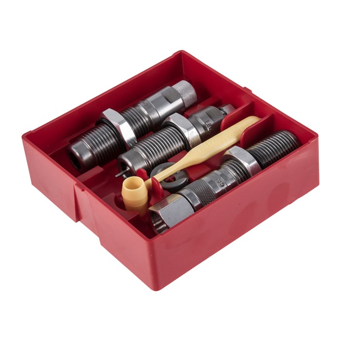 734307907624 Das Lee Steel 3-Die Rifle Set umfasst eine Full Length Sizing Die, eine Bullet Seating Die und eine Powder Through Expanding Die, einen Universal Shell Holder, einen Powder Dipper und Anleitungen/Beladungsdaten. Diese Dies sind aus Stahl, nicht aus Hartmetall, daher müssen die Hülsen geölt werden.Lieferzeit ca. 14-21 Tage.