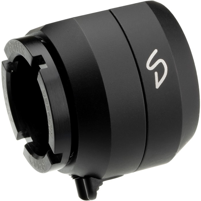 - Um ihn wieder anzubringen, richte die beiden Teile aus, drücke hinein und drehe im Uhrzeigersinn um 30 Grad. Der Stahlverriegelungsmechanismus sichert den Adapter automatisch.