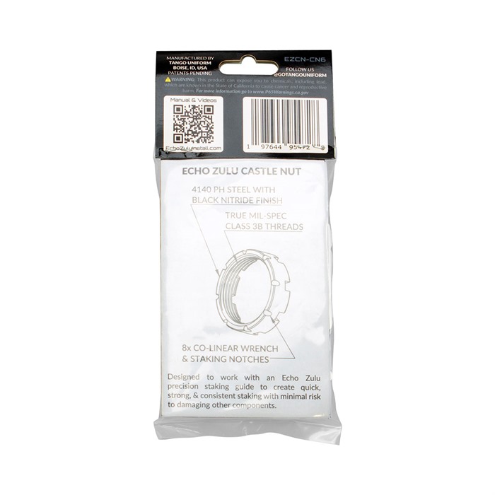 Der EZ Castle Nut ist so konzipiert, dass er mit dem bidirektionalen Stanzführer im Echo Zulu Starter Kit oder dem Echo Zulu Armorer’s Wrench verwendet werden kann. Das einzigartige Design des EZ Castle Nut ermöglicht eine starke und konsistente Stanzung mit minimalem Risiko, andere Komponenten zu beschädigen.