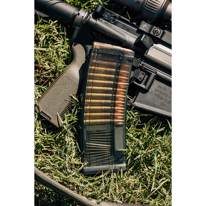 MAGPUL® TMAG® GEN M3 RIFLE MAGAZINE FOR AR-15/M4 The TMAG AR/M4 GEN M3 magazine is a highly reliable, translucent magazine for STANAG-compatible weapons chambered in 5.56x45 NATO/.223 Remington. Molded from a translucent material with an ODG/ Smoke hue, it provides shooters visibility to verify various ammunition types as well as round count. Featuring ribbed front and rear straps for improved purchase during magazine changes, the sides are left smooth to ensure visibility. Like the rest of the GEN M3 family of magazines, the TMAG incorporates similar internal geometry that translates into unmatched reliability when firing. The four-way, anti-tilt follower is paired with a durable USGI-spec, stainless-steel spring with a painted coil, which maintains the “gas gauge” capability from Magpul’s Window magazine product line. The magazine body is clearly marked to show approximate round counts when inserted in a magazine well, and the paint-pen dot matrix allows for aftermarket markings to be applied by shooters. The TMAG’s low-profile floor plate also allows for compatibility with the full line of Magpul floor-plate accessories. The TMAG is optimized for Colt-spec AR15/M4 platforms, but modified internal and external geometry also permits operation with a range of other weapons such as the HK®416 / MR556A1 /M27 IAR, FN®SCAR™MK 16 / 16S, and others. FEATURES Compatibility Wide compatibility with most 'STANAG 4179' platforms such as the AR15, M4, M16, SCAR MK16/16S, HK416, MR556, M27 IAR, IWI Tavor, and others Translucent body for round identification and capacity information Ribbed front and rear straps for improved grip Four-way anti-tilt follower and USGI-spec, stainless-steel spring enhances reliability Painted coil and marked magazine body provides visual quick reference for capacity Paint-pen dot matrix allows for additional metrics for personal preference when looking for round-count indicators Accepts current aftermarket Magpul floor-plate accessories Functions in a variety of popular platforms SPECS Caliber 5.56x45mm / .223 Remington Platform AR15, M4, M16, SA-80