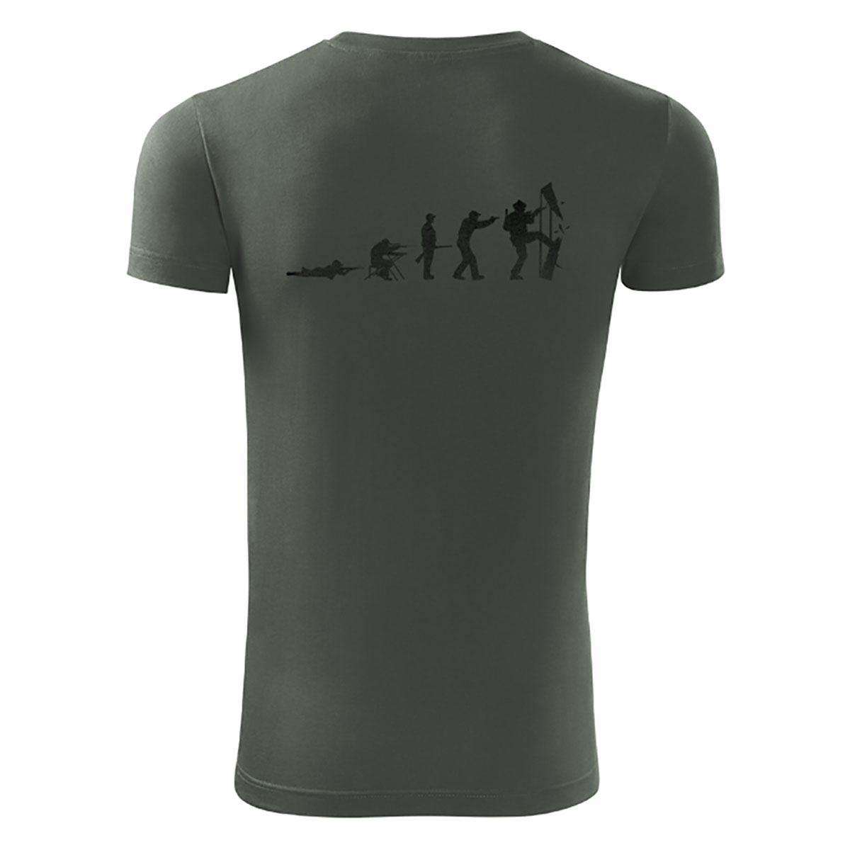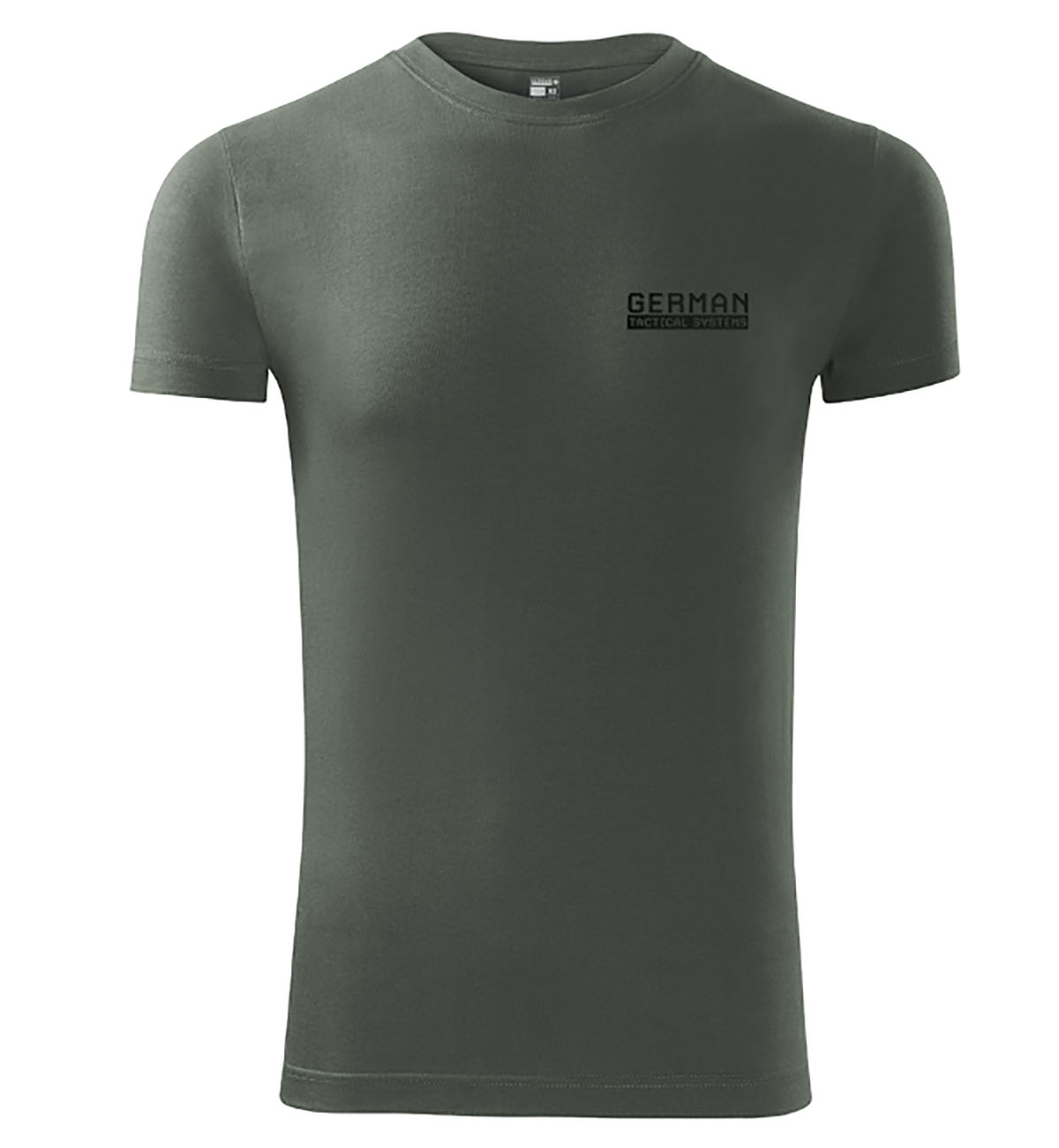 Es handelt sich um ein dunkelgraues T-Shirt mit dem Logo der German Tactical Systems auf der Brust und dem GTS Evolution-Design auf dem Rücken.
