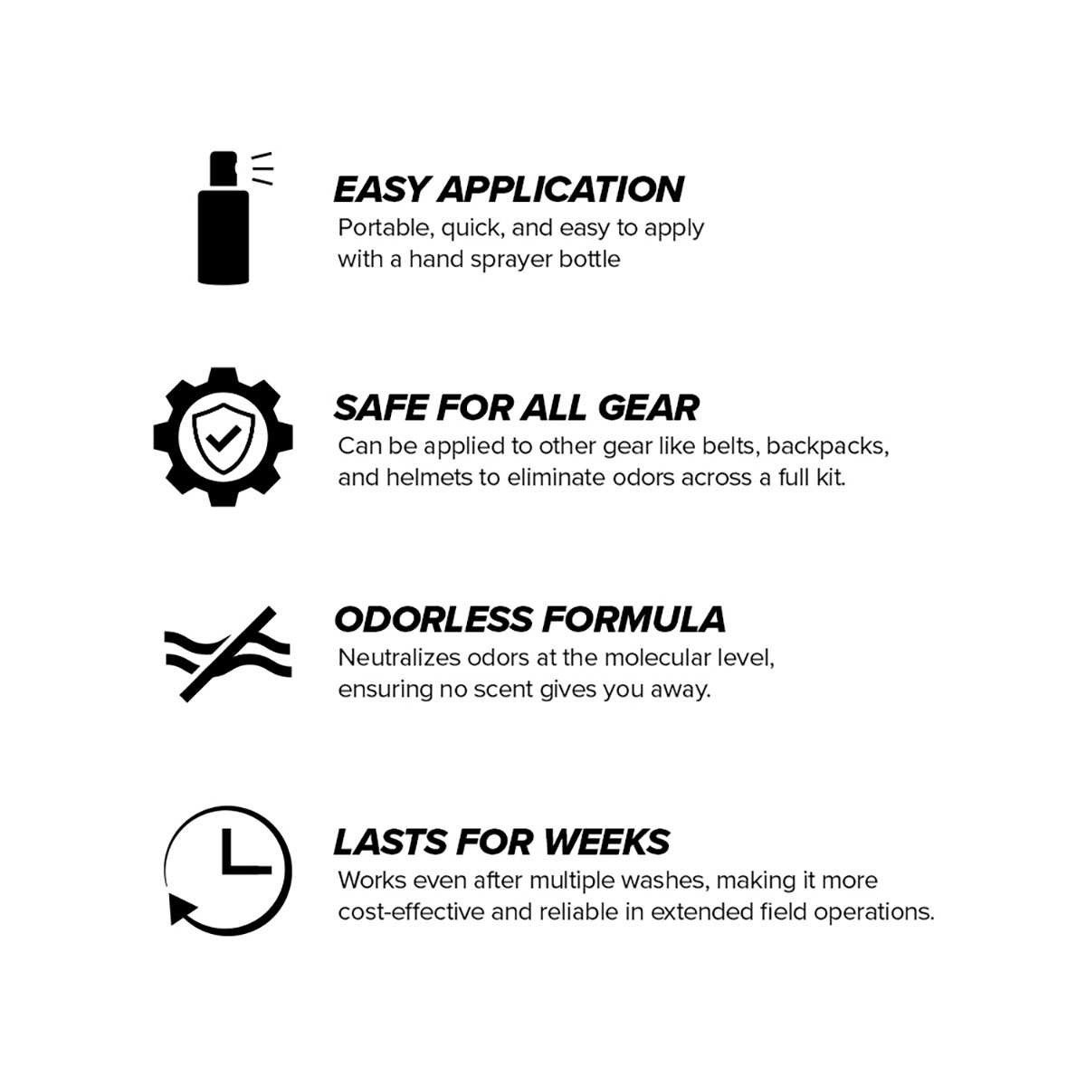Entwickelt für Ausrüstungen, die nicht einfach gewaschen werden können – wie Westen, Plattenträger und Uniformen – bietet Scent Purge langanhaltende Geruchskontrolle, ohne deine Ausrüstung zu beschädigen. Bleib bequem und sauber, egal wie lange das Training dauert.