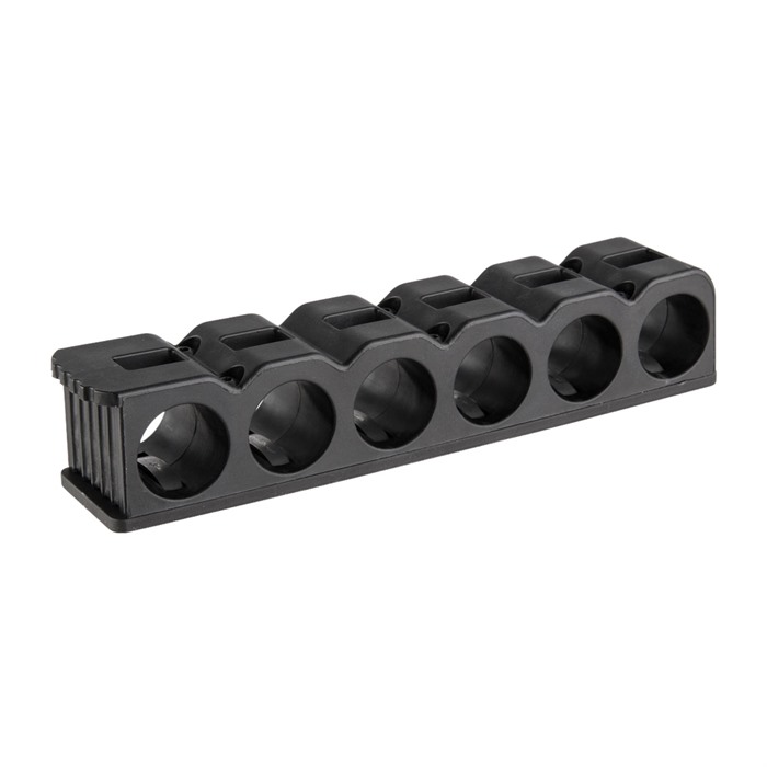 Der Universal Detachable Shotgun Shell Carrier ist mit einem Zwei-Teile-System ausgestattet und wurde für die Verwendung an Remington- und Mossberg-Empfängern entwickelt. Eine Aluminium-Rückplatte wird am Empfänger der Shotgun befestigt und verfügt über einen taktilen Tab, der am hinteren Ende des Empfängers übersteht. Drücke einfach auf den Tab, um den Shell Carrier zu lösen, und ein frischer Carrier kann schnell an seiner Stelle hinzugefügt werden.