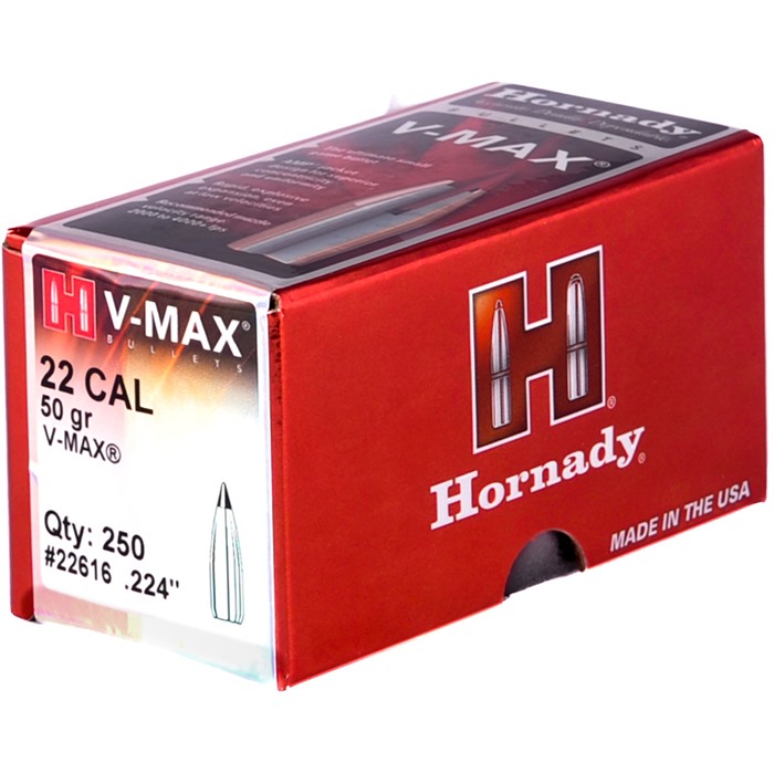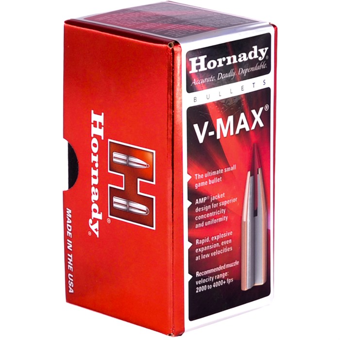 With its combination of proven materials, innovative design and streamlined profile, the Hornady® V-MAX® represents the pinnacle of what a specialized varmint bullet can achieve, offering straight-line trajectories, enhanced accuracy, dramatic expansion and explosive fragmentation at a wide range of distances and velocities. The industry's leading varmint bullet with polymer tip and streamlined design results in flat trajectories. The concentricity of the match grade AMP® bullet jacket provides maximum accuracy at all ranges as well as explosive expansion, even at velocities as low as 1600 fps. Product Features: POLYMER TIP The secret to the explosive terminal performance of the V-Max® is a hollow cavity resting between the tip's shaft and the body of the bullet. Upon impact, the hard shaft builds up speed and energy before driving into the core, causing the entire package to rapidly expand to the point of violent fragmentation, even at low terminal velocities. HIGHER BALLISTIC COEFFICIENT Hornady® combines the sharp, pointed polymer tip with the most aerodynamic profile for a high ballistic coefficient. The V-MAX® profile also provides the maximum bearing surface for added in-flight stability. SWAGED LEAD CORE The swaging process allows precise formation of the core up and around the tip, with a cavity under the tip's stem. This allows the tip to build up energy before smashing into the core, causing dramatic fragmentation of the core and jacket. PRECISE BOATTAIL & FLATBASE DESIGNS Utilizing the proper base design provides incredible in-flight stability for long-range shooting.