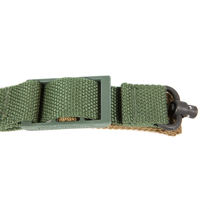- Attachment Hardware: Push Buttons – Ein 1” Push Button „QD“ Swivel ist an der Vorderseite der Sling genäht und ein weiterer 1.25" Push Button "QD" Swivel ist „gefangen“ an der Rückseite. Dies schafft eine einfache, schlanke und leichte Sling, die an jede Waffe mit Schnellverschluss-Sockets montiert werden kann.