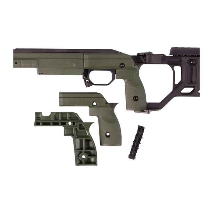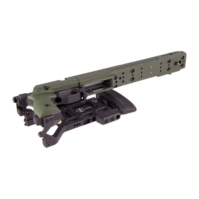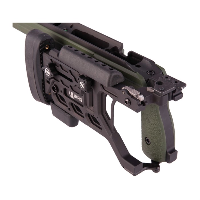Die modularen Griffplatten von KRG ermöglichen es dem Schützen, die Passform des Stocks an seine/ihre Hand anzupassen, was in Kombination mit den anderen Anpassungen einen Stock ergibt, der genau so eingerichtet ist, wie er für diesen speziellen Schützen benötigt wird.
