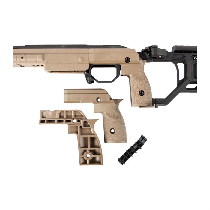 Die modularen Griffplatten von KRG ermöglichen es dir, die Passform des Schafts an deine Hand anzupassen, was in Kombination mit den anderen Anpassungen einen Schaft ergibt, der genau so konfiguriert ist, wie du es brauchst. Die neueste Generation (6) verfügt über einen neuen Längenverstellungsmechanismus, der etwas schlanker ist als die vorherigen Generationen und schnellere Anpassungen ermöglicht.
