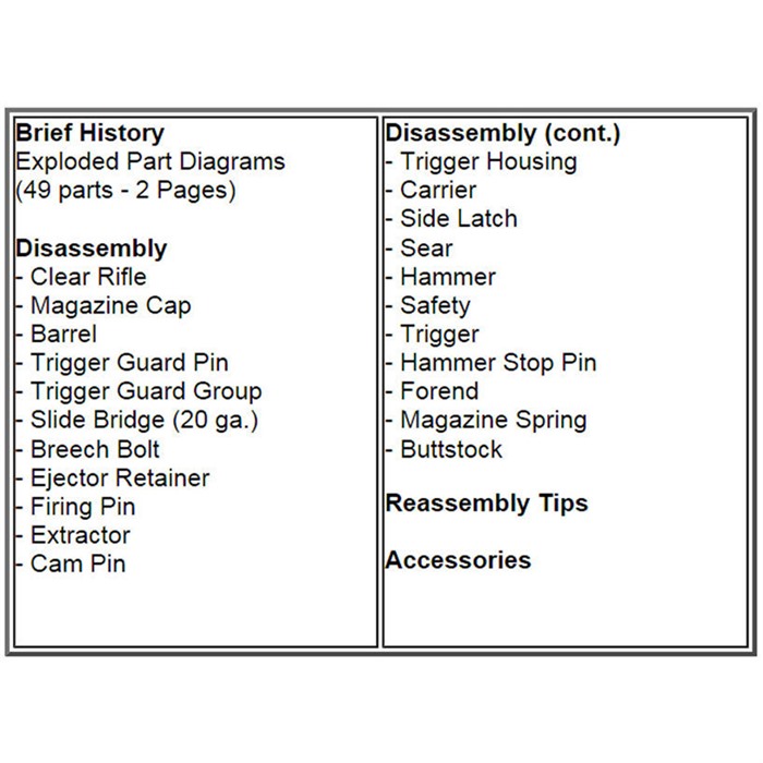 Für Besitzer der Winchester 1300 und 1200 Shotgun-Modelle ist es entscheidend, alle Informationen über die inneren Abläufe der Waffe sowie die richtigen Demontageverfahren zu haben, um sicherzustellen, dass deine Waffen einwandfrei funktionieren. Der WINCHESTER 1300 & 1200 SHOTGUNS ASSEMBLY AND DISASSEMBLY GUIDE bietet alle notwendigen Informationen für diese wichtige Aufgabe.